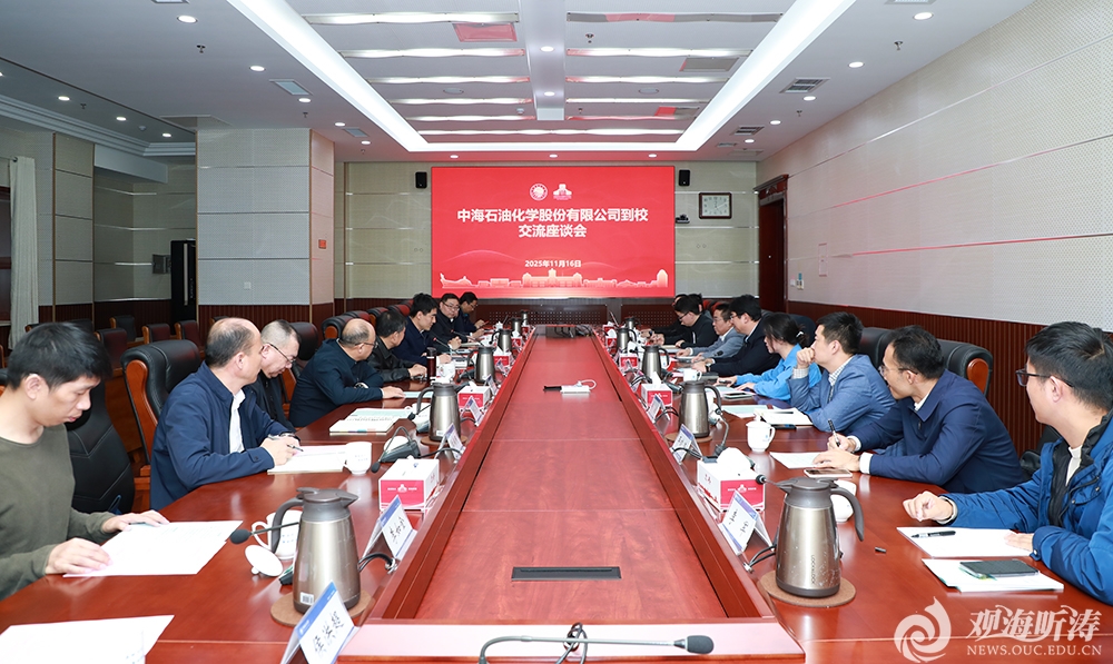观海听涛讯 11月16日,中海石油化学股份有限公司(简称“中海化学”)党委书记、董事长侯晓峰一行到校调研。学校党委常委、副校长王厚杰,中国海洋石油集团有限公司(简称“中海油”)原党组副书记武广齐陪同调研。